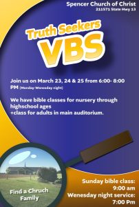 211571 State Hwy 13 Spencer, WI 54479 Directions Spencer church of Christ March 23 – 25, 2026 6:00 pm – 8:00 pm Spring Break VBS Share this:Click to share on Twitter (Opens in new window)Click to share on Facebook (Opens in new window)Click to share on Pinterest (Opens in new window)Click to email a link to a friend (Opens in new window)Like this:Like Loading... Related